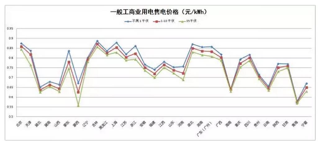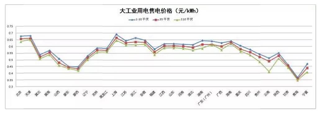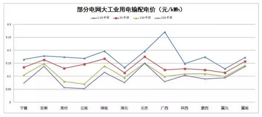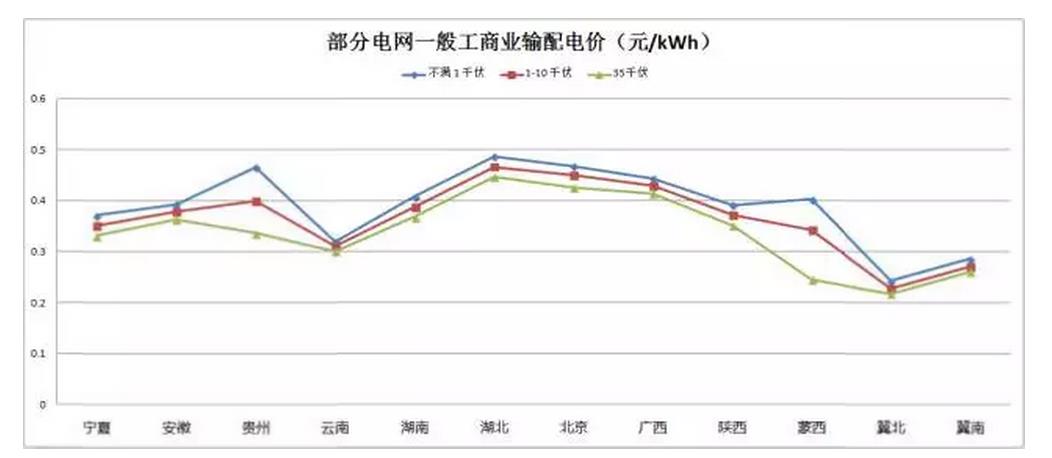 按照已经公布的部分省份输配电电价核准情况可以看出,大工业用电输配电价按照不同电压等级和所属省级电网企业而不同,且相对较低,平均价格在0.13元/kWh左右。而一般工商业的输配电价则相对较高,平均价格在0.36元/kWh左右。