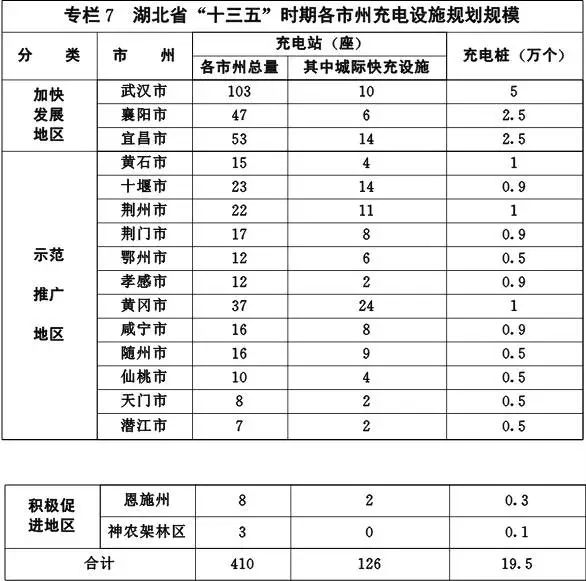 “十三五”时期,湖北省在充电设施建设方面,将各市州分为三个地区,武汉、襄阳、宜昌为加快发展地区,黄石、十堰、荆门、孝感、黄冈、咸宁、随州、仙桃、天门和潜江为示范推广地区,恩施、神农架林区为积极促进地区。其中武汉建设充电站113座,充电桩5万个,与各市州充电设施规模相比最大。