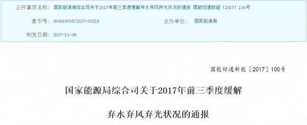 国家能源局综合司关于2017年前三季度缓解弃水弃风弃光状况的通报