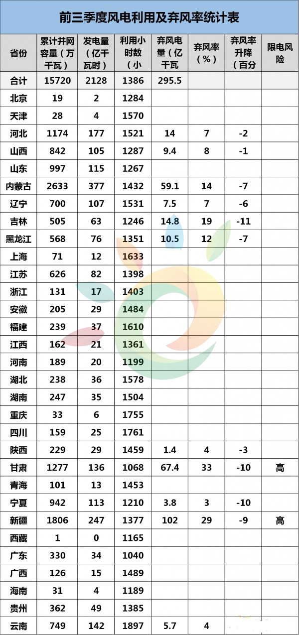 11个省区前三季度弃风量达295.5亿千瓦时!新疆弃风102亿千瓦时,几乎占据全国弃风量三分之一!