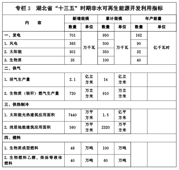 ——风电。坚持集中开发与分散开发相结合,加快推进资源较为丰富、消纳条件较好的随州、孝感、恩施、襄阳等地实现风电规模化集中高效开发利用,推动风能资源适宜、靠近负荷中心的分散式风电项目建设。到2020年,新增风电装机容量365万千瓦,累计达到500万千瓦。