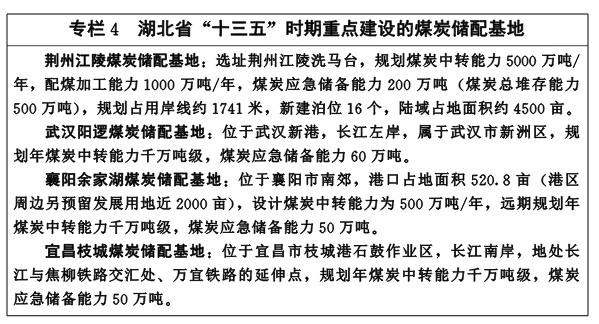 1、加强煤炭物流建设。积极支持配合蒙西至华中地区铁路煤运通道建设,充分发挥铁水联运、水陆联运等综合交通运输优势,建设煤炭物流公共服务平台,推进荆州江陵、武汉阳逻、襄阳余家湖、宜昌枝城等煤炭物流储配基地建设,打造煤炭储备、物流配送、加工增值和区域交易中心。推进以恩施、宜昌山区生产生活用煤为主的专用储配基地建设,解决优质煤炭替代问题。
