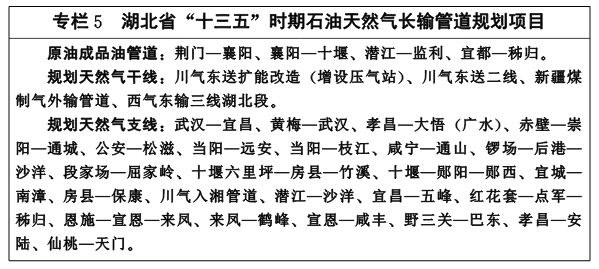 2、加强油气基础设施建设。建设荆门—襄阳、襄阳—十堰、潜江—监利成品油管道工程和三峡枢纽成品油翻坝运输宜都至秭归管道及配套工程。积极支持川气东送扩能改造、川气东送二线等国家天然气主干管道湖北省段建设,推进武汉—宜昌、十堰—竹山—竹溪等省内支线、联络线建设。“十三五”期间,全省新建天然气高压长输管道2000公里左右。完善城镇燃气基础设施,实施“县县通”“气化乡镇”工程,实现全省县级以上区域天然气利用全覆盖,力争2020年全省乡镇天然气通气比例达到40%左右。科学规划布局加气站建设,争取到2020年全省天然气加气站达到500座,船用LNG加注站12座。