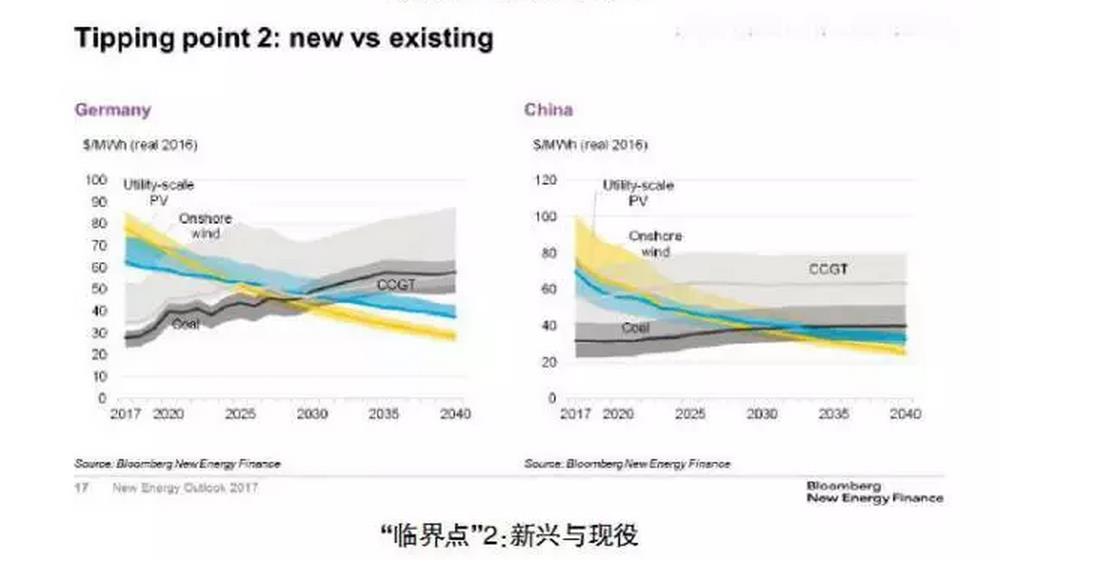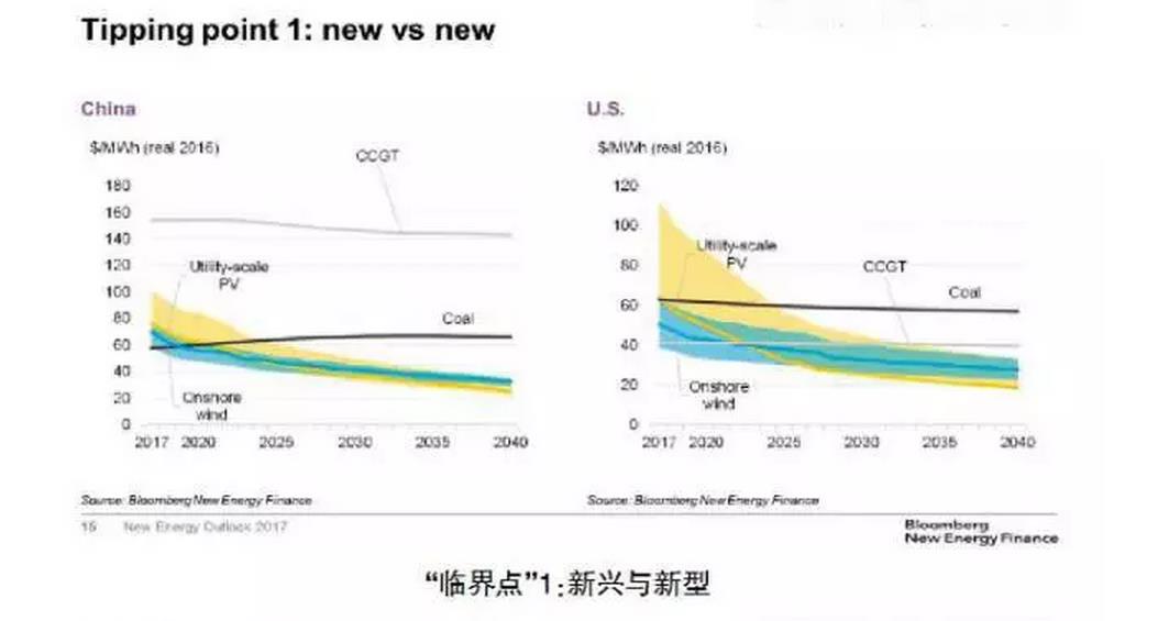 有两个“临界点”值得关注。第一个“临界点”是“时间”,即在何时风电和太阳能发电工程可以在没有补贴的情况下,直接参与到与新建燃煤电厂或气电站的竞争;第二个“临界点”是“成本”,指在何时风电和太阳能发电的成本可以降低至低于现役煤电或气电站运行成本。
