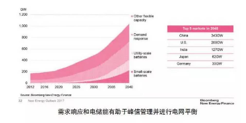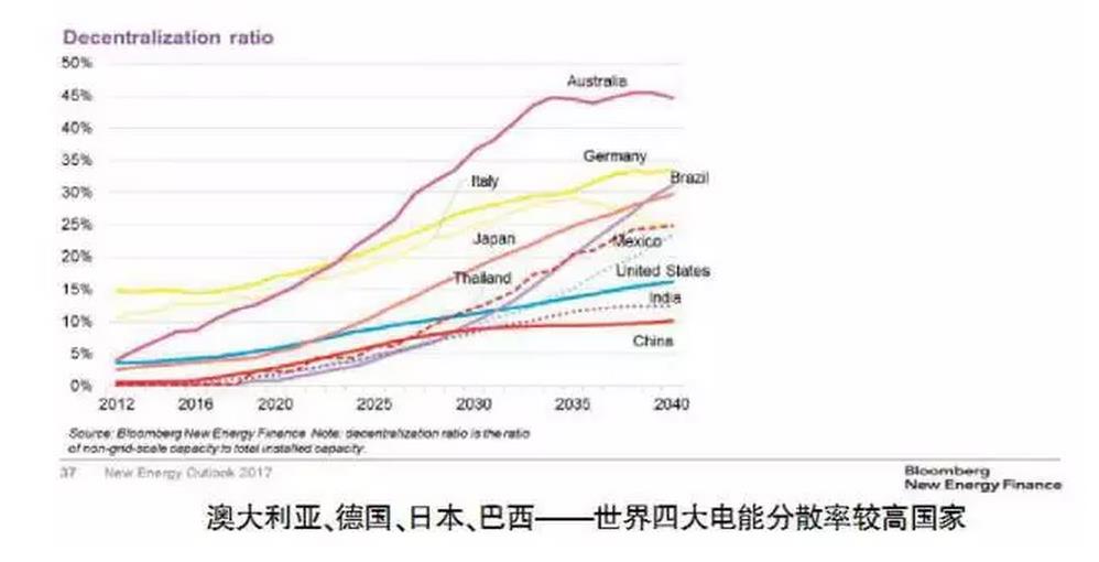 通过“behind-the-meter”电储能计划,将引发新一轮太阳能发电产业的爆发。在此方面澳大利亚先行一步,该国将在2040年完成总装机容量中45%的容量,达成 “behind-the-meter”电储能计划目标。同时,巴西、日本、墨西哥以及德国的电能分散率将超过30%。这也表明,处于电力产业链终端的消费者将在电网范畴内占据更多的能源设备资源。