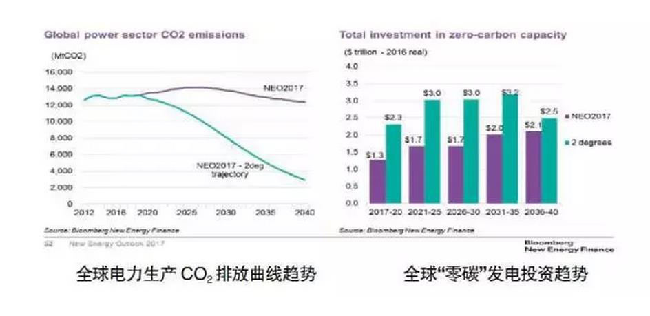 完成这样的“减排目标曲线”,需要世界各国共同遵守巴黎协定中各国的减排贡献值目标。通过分析发现,在不增加任何附加成本的前提下,完成这样的减排目标是真实可行的。根据目前的减排现状,与达成“降低2摄氏度”目标仍存在一定差距,因此到2040年,全球仍需要约5.3万亿美元的投资来推进“零碳”发电发展以达成减排目标,与此同时,关于气候政策的风险也应引起关注。