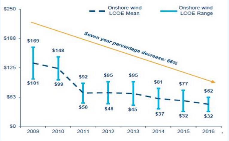 全球陆上风电的单位成本不断下降(美元/MWh)