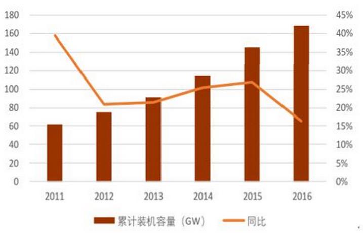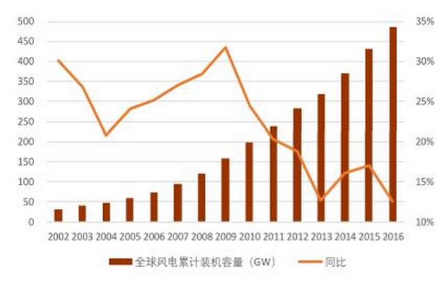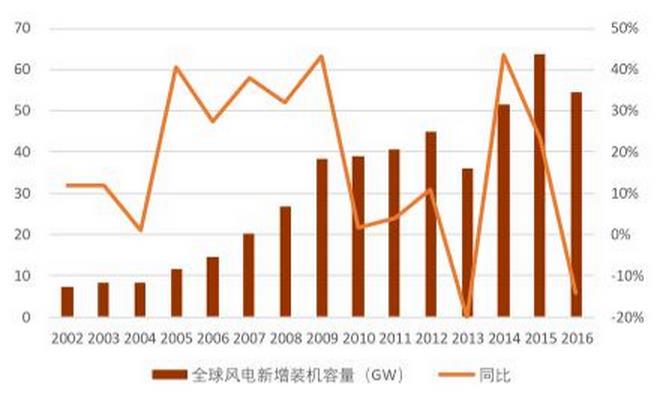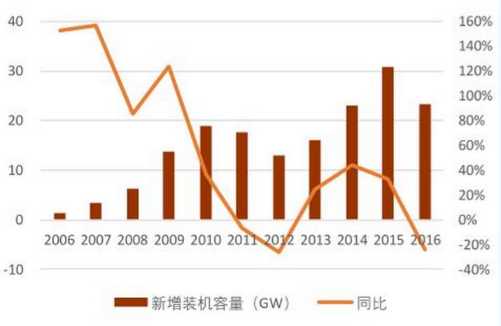 国内风电新增装机容量快速发展,近年有所波动,总体上进入平稳增长的阶段。2006-2016 年的 10 年间,年均复合增速超过 30%,是当之无愧的成长性行业。