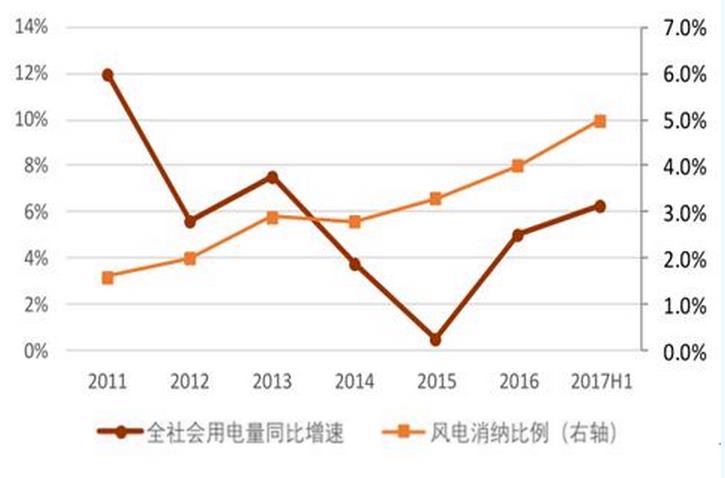7 月份,青海特高压项目正式纳入国网公司“十三五”电力规划,青海两个“千万千瓦级清洁能源基地”开发即将提速。其中规划,青海至河南直流特高压通道工程电压选择±800 千伏,直流送电距离约 1500 多公里,最大送电容量按 1000 万千瓦考虑。国内风电消纳比例在不断提升,除了火电、水电以外,风电正成为重要的发电量来源。