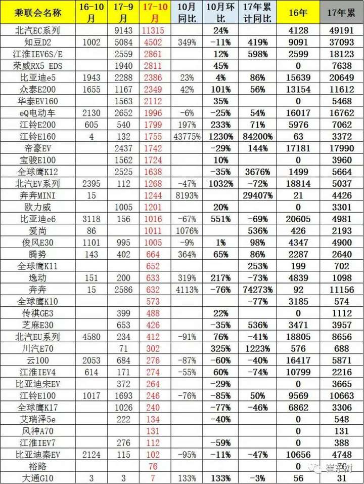 11月8日,全国乘联会发布厂家数据,2017年10月新能源乘用车销量达到6.5万辆,环比9月增长0.7万台,同比增速102%。其中A00级纯电动乘用车销量为3.43万台,占乘用车65%份额,为最大市场。全国乘联会秘书长崔东树预测,2017年新能源乘用车年度销量50万应该能够顺利超越。