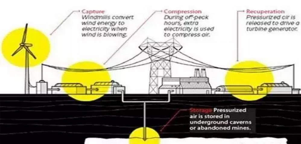 压缩空气储能采用空气作为能量的载体,大型的压缩空气储能利用过剩电力将空气压缩并储存在一个地下的结构(如地下洞穴),当需要时再将压缩空气与天然气混合,燃烧膨胀以推动燃气轮机发电。