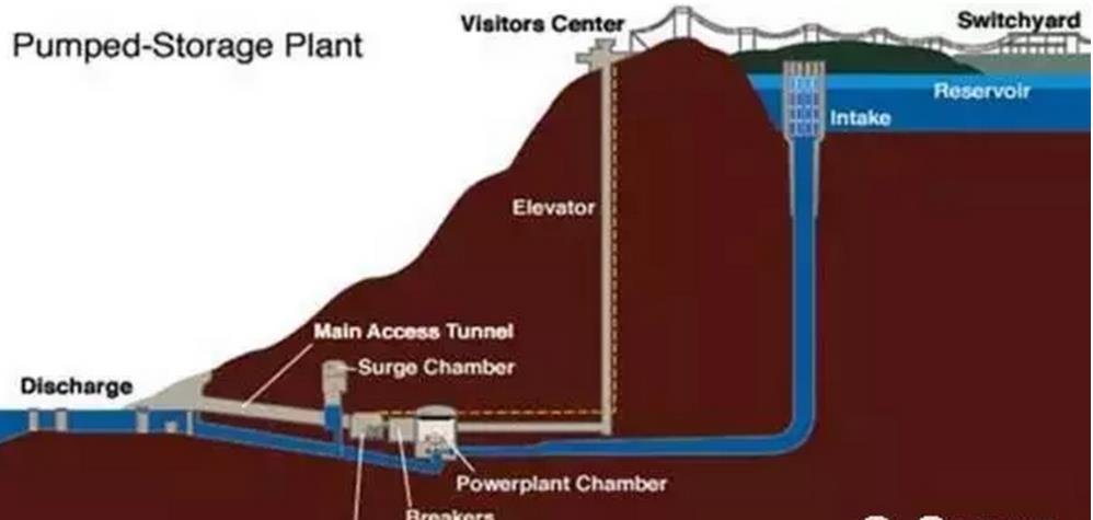 电网低谷时利用过剩电力将作为液态能量媒体的水从低标高的水库抽到高标高的水库,电网峰荷时高标高水库中的水回流到下水库推动水轮机发电机发电。