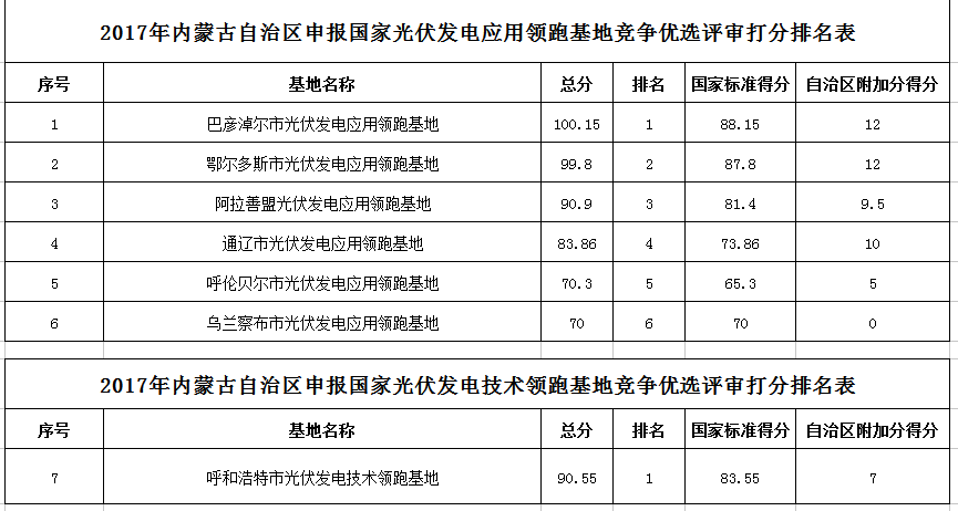 2017年内蒙古自治区申报国家光伏发电应用领跑基地竞争优选评审打分排名表。