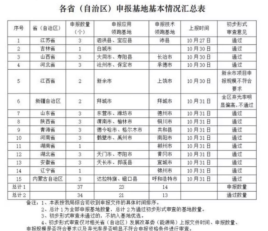 现我局按截止时间对相关省(自治区)发展改革委(能源局)申报文件进行了统计和初步形式审查。截至10月31日,共有15个省(自治区)向我局正式提交了共37个光伏发电领跑基地申报材料,其中包含23个应用领跑基地和14个技术领跑基地;共有14个省(自治区)的34个光伏发电领跑基地通过了初步形式审查,其中包含21个应用领跑基地和13个技术领跑基地。为保障领跑基地优选工作公平、公正、公开,现按类别对申报基地的基本情况予以公开。