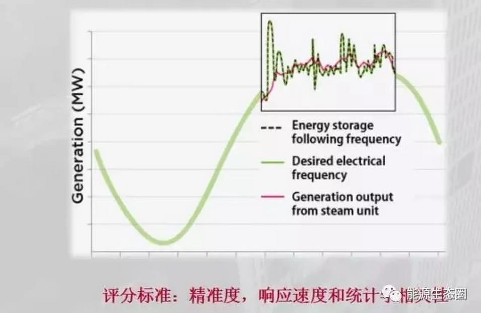 以美国为例,美国的频率是60Hz,电力公司、电网调度者希望这个频率一直维持在60Hz,如果发电超过了负荷,频率就会上升,比如从60Hz上升到60.5Hz或者是更高;相反,如果发电低于负荷,频率就会下降。所以电力系统里面设计了很多自动的机制,当出现负荷和发电不均衡的时候,这些机制就会自动调节。负荷多了,发电就增高一点;发电多了,发电就下降一点。这些自动机制目的就是为了保持频率永远是一条直线。这个跟发电的概念不一样,发电就是花1分钱买1分的电,调频这件事完全是为电网服务的。在美国就是利用市场机制,设计一个市场,然后根据调频的精准度来付钱。简单来说就是系统能力越高,响应越精准越快速,这个系统就越有价值。这里面涉及到一个非常复杂的数学公式,但是这个公式可以把发电的出功和客户的要求,通过统计学的相关性,把标准量化。