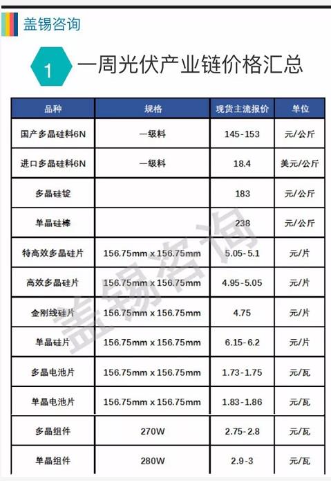 本周多晶硅电池的主流价格为1.74元/W,单晶硅电池降到1.75元/W时,即可实现单多晶同价。