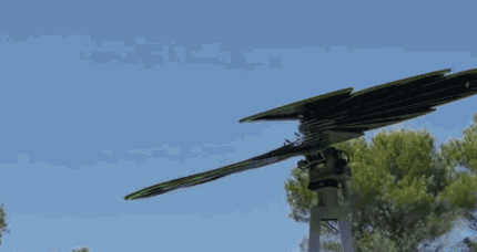 其次,智能花儿内置有两个可移动轴及光线传感器,当需要发电时,它可以在瞬间展开。这个双轴跟踪系统能让它始终确保与吸收光保持90°角,从而在提供最大的向阳发电面积的同时,获得最大的太阳能吸收值。