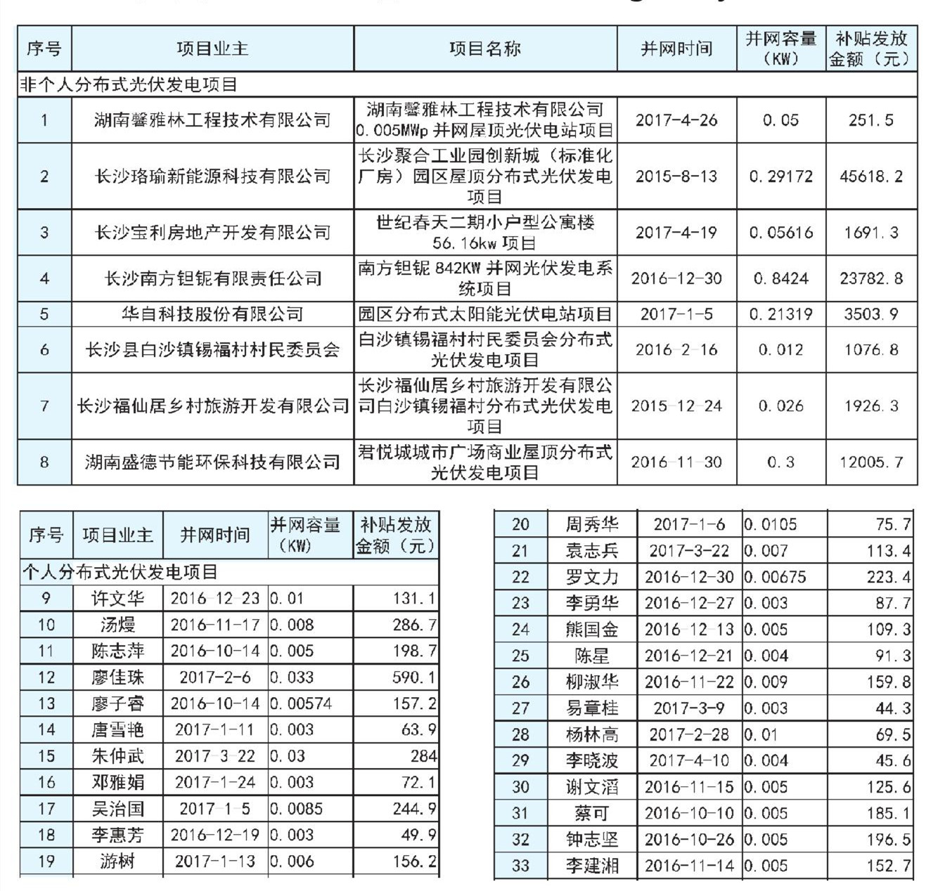 长沙市2017上半年度分布式光伏发电拟补贴项目公示