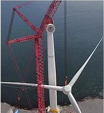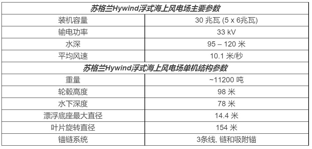 该风电场由5台各6MW的风机组成,总容量为30MW,每座浮塔重达11200吨。风电场海域水深95-120米,离岸25公里。其他参数如下: