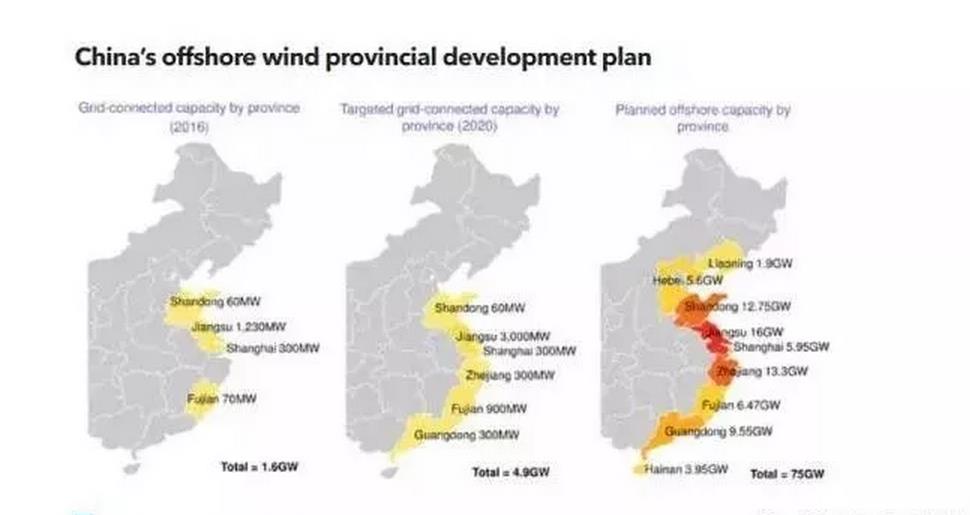 市场规模:2016 年,中国海上风电累计装机容量为1.6GW,为世界第三大海上风电市场,排在英国和德国之后。按照现有的海上风电项目规划,中国将超额完成原定5GW的2020年海上风电累计并网目标。其中,江苏省还制定了3GW的2020 年省级目标。
