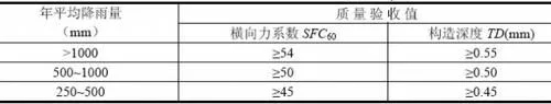 《沥青路面设计规范》提到,高速公路、一级公路沥青路面的抗滑性能,以横向力系数测试车在 60km/h 车速下测得的横向力系数 ( SFC60 ) 和构造深度 ( TC ) 为主要指标。