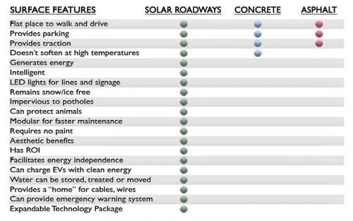 光伏发电路面设想在 2006 年由美国的一对科学家夫妇提出并开始研究。布鲁索夫妇发明出一种正六边形的太阳能电池板(SolarRoadway),其表面是一种超耐磨的特殊玻璃,承重最高达 125 吨,能保证汽车的安全行驶。Solarroadways 官网对 Solarroadway、混凝土、沥青三种不同路面材料做了对比。