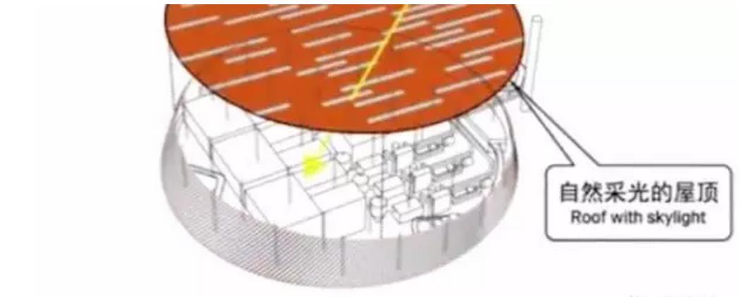 这个巨大的圆形建筑屋顶面积近6.6万平方米,其中约4万平方米将被铺上光伏板,使建筑本身可通过太阳能实现可持续供应。剩余的屋顶则用于屋顶绿化、水回收系统以及天窗。