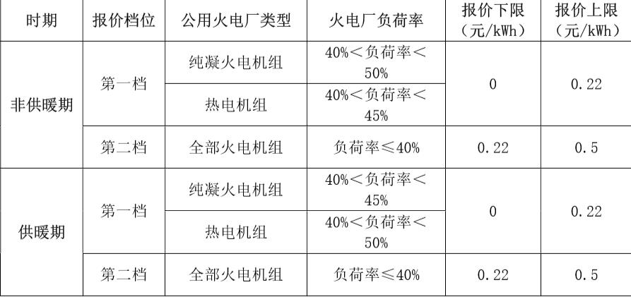 第二十五条 深度调峰交易采用“阶梯式”报价方式和价格机制,发电企业在不同时期分两档浮动报价,具体分档及报价上、下限见下表: