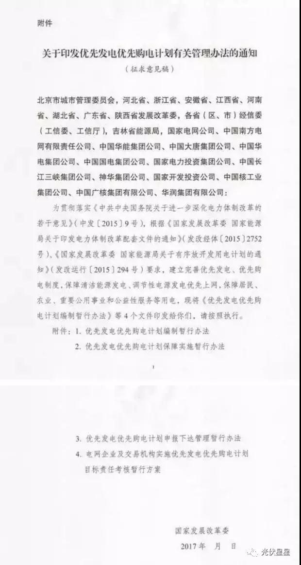国家发改委近日发布《关于征求优先发电优先购电计划有关管理办法意见的函》。据悉,优先发电优先购电计划有关管理办法已被列为2017年重点规范性文件,在征求第一轮意见基础上,目前已草拟了《关于印发优先发电优先购电计划有关管理办法的通知(征求意见稿)》,包括《优先发电优先购电计划编制暂行办法》、《优先发电优先购电计划保障实施暂行办法》、《优先发电优先购电计划申报下达管理暂行办法》、《电网企业及交易机构实施优先发电优先购电计划目标责任考核暂行方案》4个附件,相关征求意见应于8月29日前反馈国家发改委经济运行调节局,其中《优先发电优先购电计划编制暂行办法》指出: