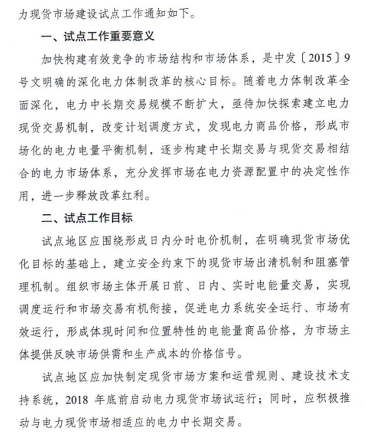 国家发展改革委力公厅、国家能源局综合司于8月28日联合下发了《关于开展电力现货市场建设试点工作的通知》特急文件,通知中称,2018年底前启动电力现货市场试运行,积极推动与电力现货市场相适应的电力中长期交易。结合各地电力供需形势、网源结构和市场化程度等条件,选择南方(以广东起步)、蒙西、浙江、山西、山东、福建、四川、甘肃等8个地区作为第一批试点,加快组织推动电力现货市场建设工作。