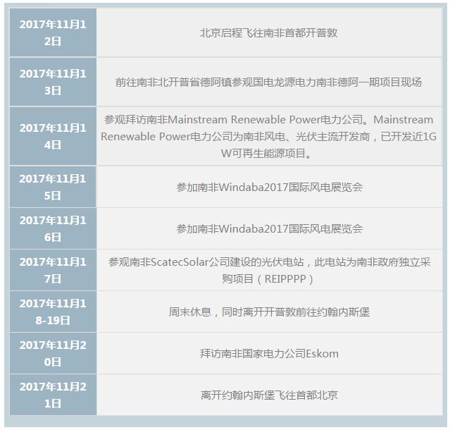 为深入考察南非当地的风电市场,2017年11月12-21日,中国农机工业协会风力机械分会将组织考察团前往南非,行程如下: