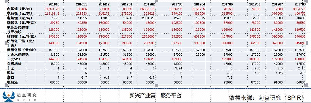 起点研究(SPIR)数据显示,2017年8月,国内钴酸锂报价在38.5-40万元/吨,电解钴在40万元/吨,四氧化三钴37-38.5万元/吨;自2016年7月起,电解钴及钴酸锂价格开始节节攀升。