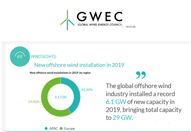 全球风能理事会(GWEC)近日正式发布全球海上风电权威数据:2019年全球新增海上风电装机6.1GW,创历史新高,累积装机达到29GW;全球新增装机前三是:中国(2.3GW)、英国(1.8GW)、德国(1.1GW)。中国首次超越英德,跻身全球新增装机第一大国。