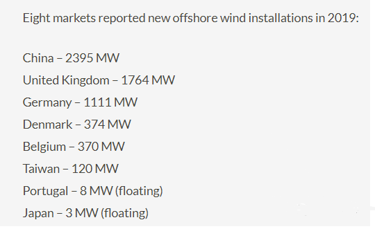 美国、日本、中国台湾、越南、韩国等地区有着很大的海上风电雄心。基于此,全球风能理事会预测,2020-2024年全球新增海上风电装机将超过50GW。