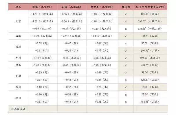 特别是部分工商业发达的大型城市,统计了国内大型城市的峰谷电价差,根据目前铅炭储能最 低 0.5 元左右的度电成本,电价差大于 0.8 元/kWh 的地区都有经济性,这些地区对应的 2015 年用电量合计约 为 3972.54 亿 kWh,若其中 10%的用电量通过储能来进行削峰填谷,大约需要 1.2 亿 kWh 的储能设备(其容量对应日 充放电量) ,若按铅炭储能每 kWh 约 1250 元的投资额计算,则对应累计市场规模 1500 亿元;若按锂电储能每 kWh 约 2000 元(考虑未来五年成本有望明显下降)的投资额计算,则对应累计市场规模 2400 亿元。
