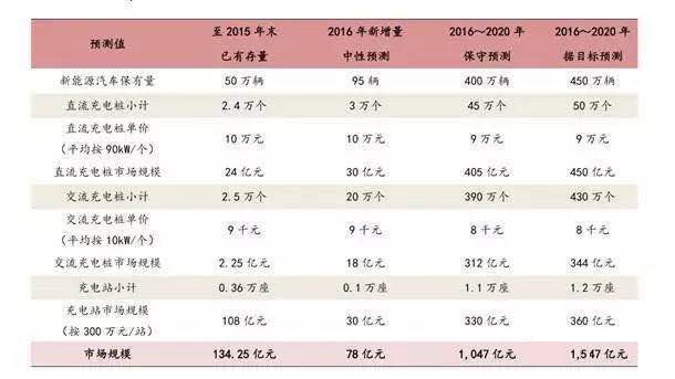 依据当前全国充电桩建设进度,中性预测,2016 年充电桩新增市场规模约 78 亿元(含充电站基建投入),如 表 6 所示,若以《发展指南》中的“十三五”期间建设目标为准,直流充电桩新增 50 万个、交流充电桩新增 430 万个、 充电站新增 1.2 万座,对应投资规模分别为 450 亿元、344 亿元、360 亿元,即“十三五”期间新增市场规模约 1,154 亿元,保守也有 1047 亿元,对应充电设备中的储能模块市场不到 100 亿元。