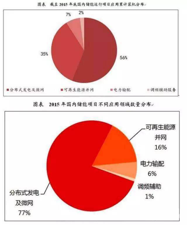 目前,国内的储能市场主要分为两类,一类是用户端分布式发电及微电网中储能的应用,占比大约为56%,另一类是集中式风光电站(可再生能源并网)储能应用,占比约为35%,目前两者累计装机规模已超过国内市场的90%,电力输配和调频辅助服务占到9%左右的市场份额。