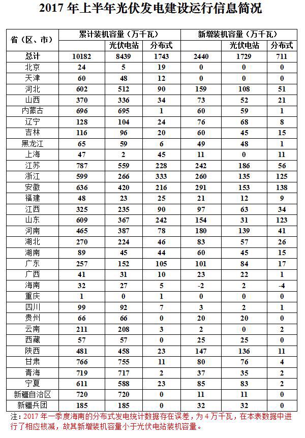 全国各省(区、市)2017年上半年光伏发电建设运行信息简况详见附表。