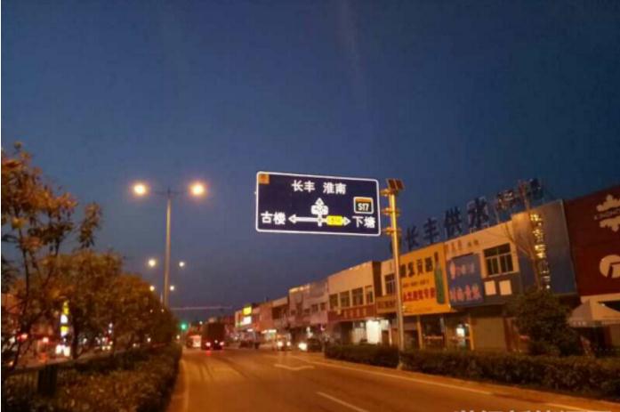 原来这是安装到位的国家公路网合肥市域交通标志调整示范工程“太阳能发光式标牌”。据悉,这在全省尚属首次。