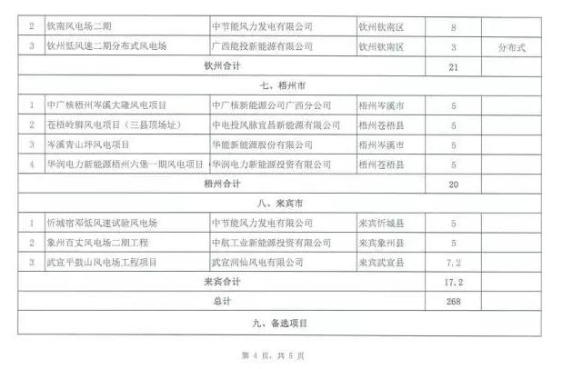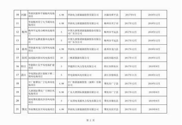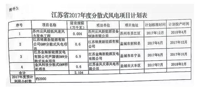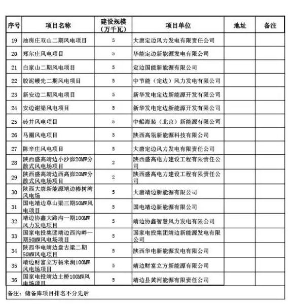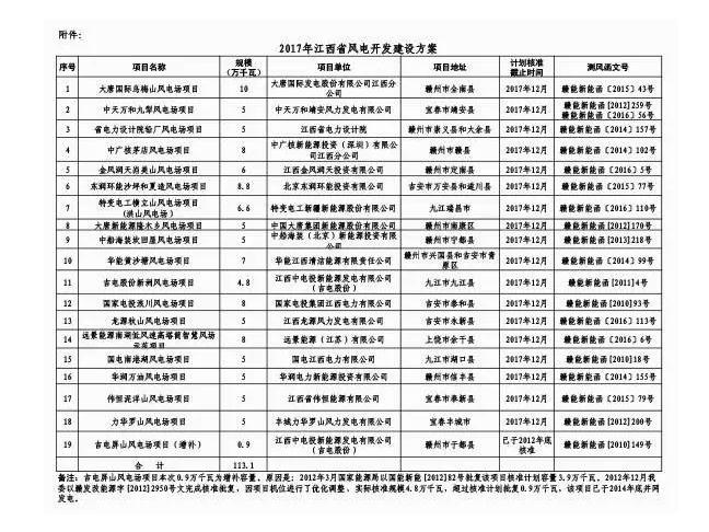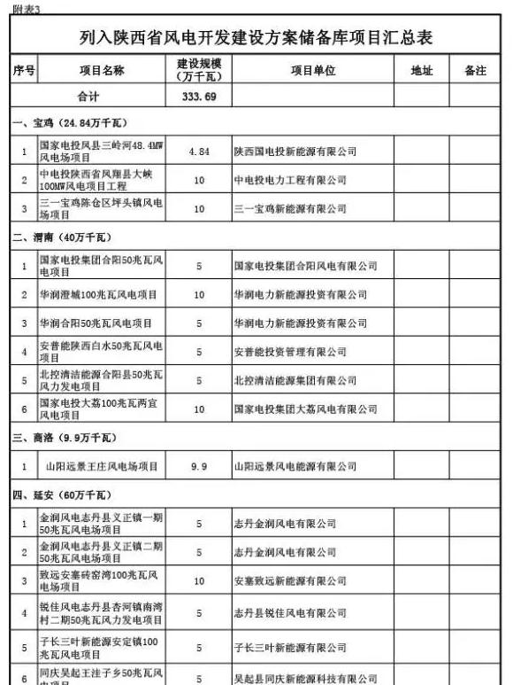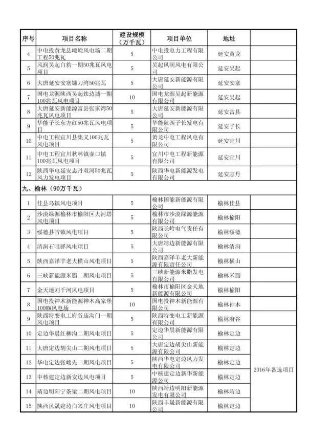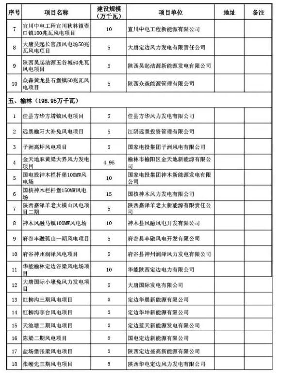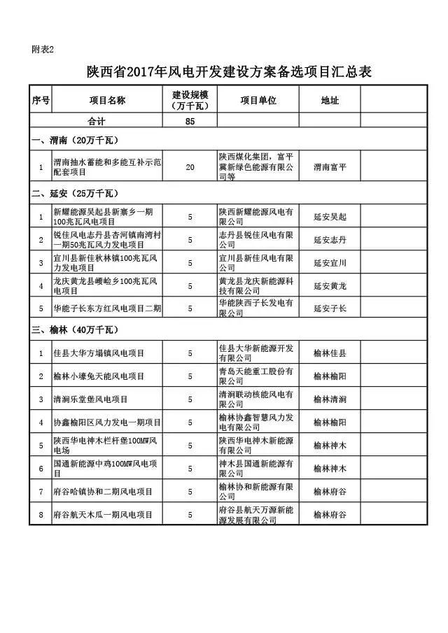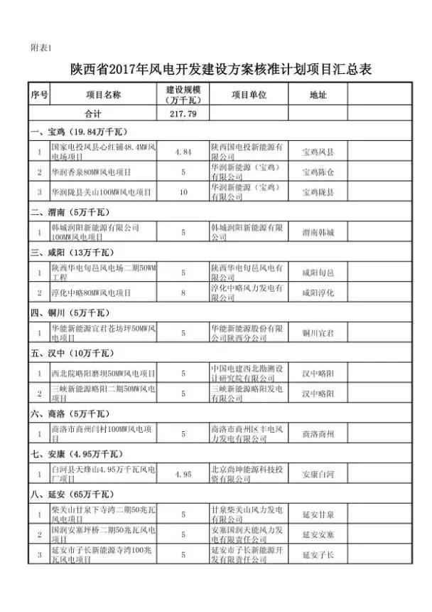 陕西省2017年风电开发建设方案核准计划项目汇总表
