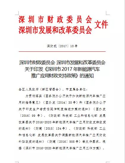 深圳市财委发布深圳市2017年新能源汽车推广应用财政支持政策