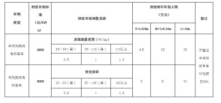 按非快充类纯电动客车、快充类纯电动客车的电池系统能量密度、快充倍率和车辆长度给予补助。