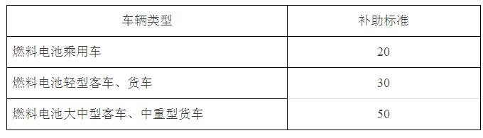 燃料电池乘用车20万元/辆,燃料电池轻型客车、货车30万元/辆,燃料电池大中型客车、中重型货车50万元/辆。
