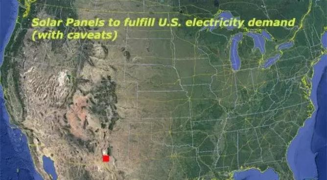 马斯克在会上很自信地表示,如果想靠太阳能来解决美国的全部电力需求,只要在内华达州、犹他州或者德克萨斯州比较小的地方铺设100平方英里的太阳能面板就行。