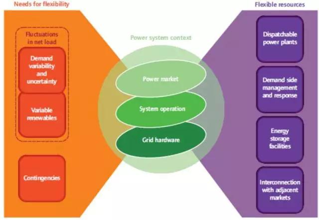 IEA将风电和光伏统称为Variable Renewable Energy,即VRE。作为风电和光伏的统称,VRE很好的概括并体现了风电和光伏发电的特点。而解决VRE的消纳问题,关键则在于电力系统柔性是否充足。柔性一词在欧美国家较为常用,根据IEA的定义,柔性(Flexibility)是描述一个电力系统应对可预期的或者不可预期的变化的能力,以此保证发电和用电的平衡。也就是说柔性是描述一个电力系统应对突发“不平衡事件”的能力,体现为单位时间内向上或向下输出一定功率的能力。当电力系统出现负荷波动或不确定性,以及发电机组突然停机脱网等特殊情况时,电力系统都需要通过柔性源加以应对。随着可再生能源发电规模的增加,电力系统的柔性能力显得愈发重要。为什么提供柔性能力的是柔性源而不是发电机组呢?因为柔性源不只是发电机组,还包括现货市场(通过电价信号引导负荷)、需求响应(demand response)、储能和区域间联络线(跨区或者跨国电力交易)等多种方式,如下图所示。