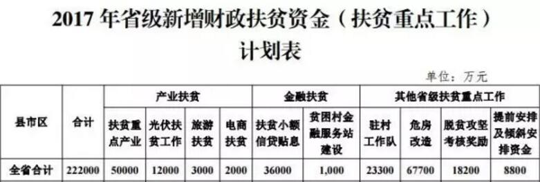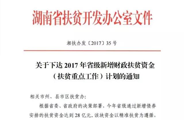 近日,省扶贫办发布《关于下达 2017 年省级新增财政扶贫资金 (扶贫重点工作)计划的通知》。通知指出,根据省委、省政府的决策部署,今年省级通过新增债券安排的扶贫资金达到 28 亿元。