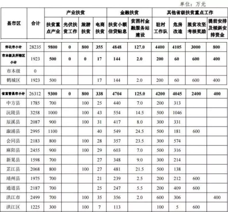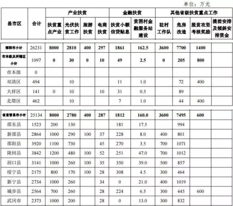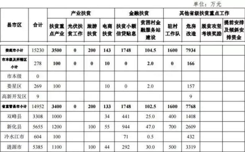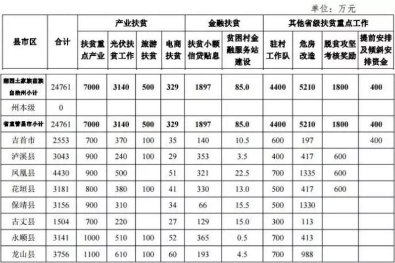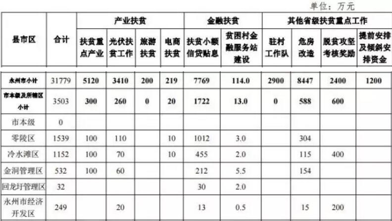 包括扶贫重点产业、 光伏扶贫(扶贫资金部分)、旅游扶贫、电商扶贫、扶贫小 额信贷贴息、贫困村金融服务站建设、驻村工作队、贫困农 户危房改造、脱贫攻坚考核奖励和提前安排及倾斜安排等十项工作的资金计划。