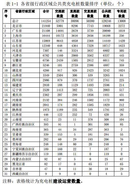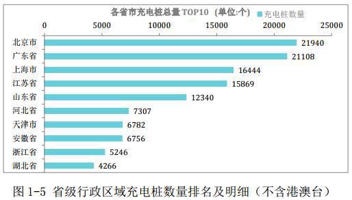 省级行政区域内所拥有的公共类充电桩数量前十的分别为:北京21940个、广东21108个、上海16444个、江苏15869个、山东12340个、河北7307个、天津6782个、安徽6756个、浙江5246个、湖北4266个。