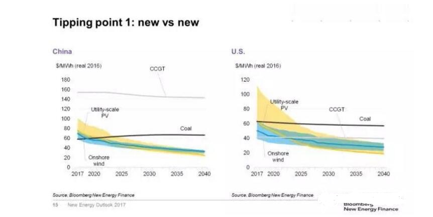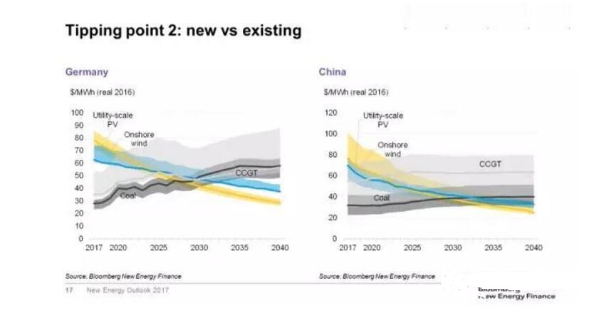 第一个临界点是:在没有补贴的情况下,新建风电、光伏电站发电成本可与新建煤电、天然气电站竞争。在目前的市场条件下,在很多国家已经接近这一临界点。在德国,新建陆上风电的发电成本已经低于煤电、天然气发电;在中国,目前煤电成本在各类电源中依然是最低的,但是预期2019年陆上风电成本将低于煤电、2021年光伏成本也将低于煤电;在美国,天然气发电是各类电源中成本最低的,但预计2022-2023年风电、光伏成本均将低于天然气发电;在印度,预计2020年起新建光伏将在全国范围内低于煤电。