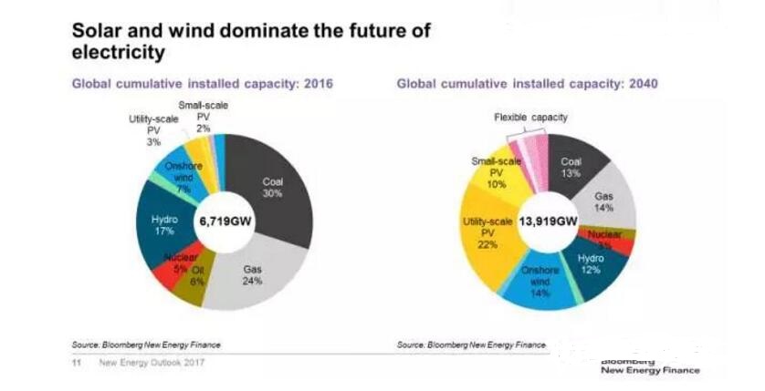 根据BNEF的预测,2040年太阳能光伏将成为主导能源之一,占全球发电总装机的32%;风电14%、水电12%、煤电14%、天然气13%、核电3%。